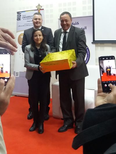 ![]() La lauréate Sara MAGHZAZ entourée de M. Mohammed ERRAMI, Président de l’Université Abdelmalek Essaadi de Tétouan et M. Mohamed LARBI KERKEB, Doyen de la Faculté Pluridisciplinaire de Larache. |