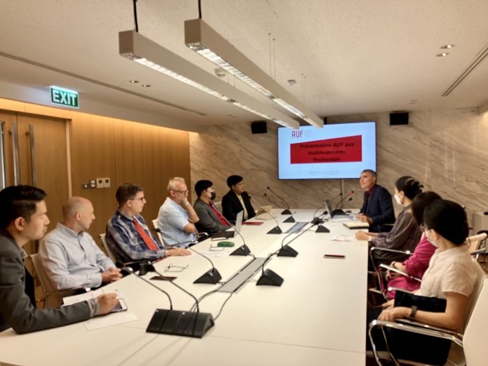 La rencontre a souligné les différentes opportunités offertes par l’AUF aux établissements membres visant à consolider la présence de l’AUF et à renforcer son impact en Thaïlande, notamment la mise en place d’un point focal en Thaïlande, le recrutement de nouveaux membres et la création de nouveaux Clubs Leaders Etudiants Francophones (CLEFs). Des liens avec le milieu socio-économique ont été évoqués, notamment à travers des partenariats avec des entreprises françaises en Thaïlande.