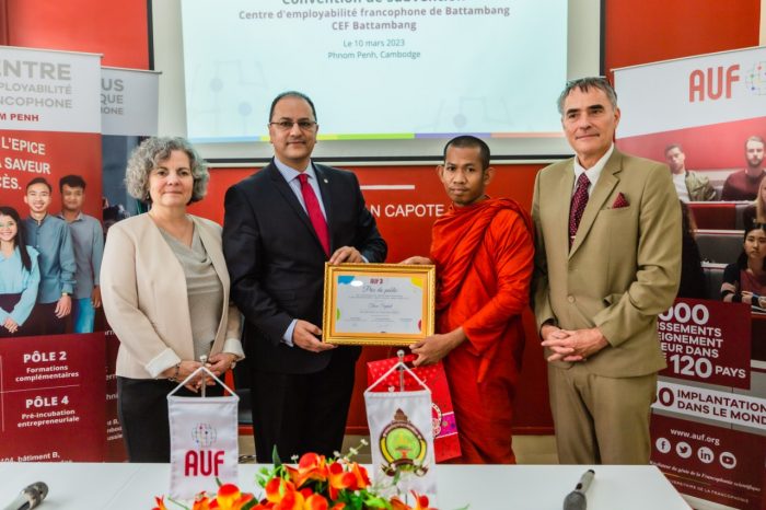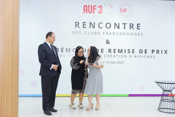 Le Recteur a profité aussi de cette occasion pour remettre les prix du concours régional de création d’affiches qui a été lancé en janvier dernier, à l’occasion du 30e anniversaire de l’AUF Asie-Pacifique, à Phnom-Penh. Il a également présenté les prochaines actions de l’AUF en faveur de la jeunesse francophone dont la mobilité estudiantine, divers concours internationaux et l’organisation du 2ème Congrès de la Jeunesse francophone, l’un des événements majeurs de la 3ème édition de la Semaine mondiale de la Francophonie scientifique qui se tiendra à Québec (Canada) du 30 octobre au 2 novembre 2023.