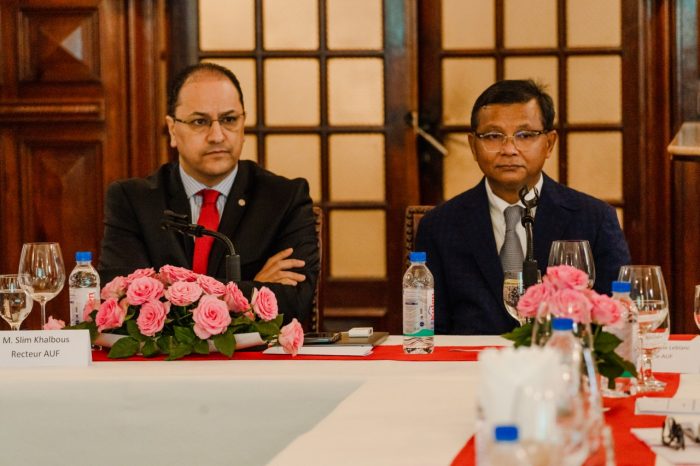 Réaffirmant le soutien du gouvernement cambodgien à la francophonie, il a hautement apprécié la contribution de l’AUF au développement de l’enseignement supérieur du Cambodge, par le biais de son bureau national, du centre d’employabilité francophone (CEF) à Phnom-Penh et du futur CEF à Battambang.