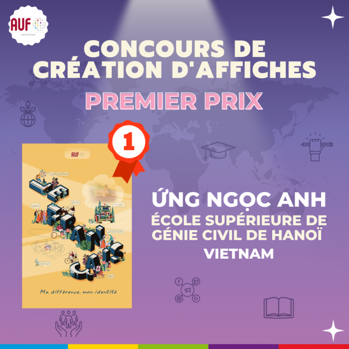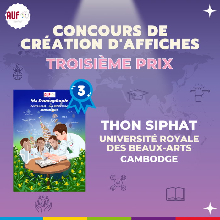 À l’occasion de son 30e anniversaire, l’AUF-Asie-Pacifique a lancé en novembre dernier un concours de création d’affiches intitulé « Ma francophonie, mon avenir, mon identité ». Ce concours est destiné aux étudiants francophones des établissements membres de l’AUF en Asie-Pacifique.