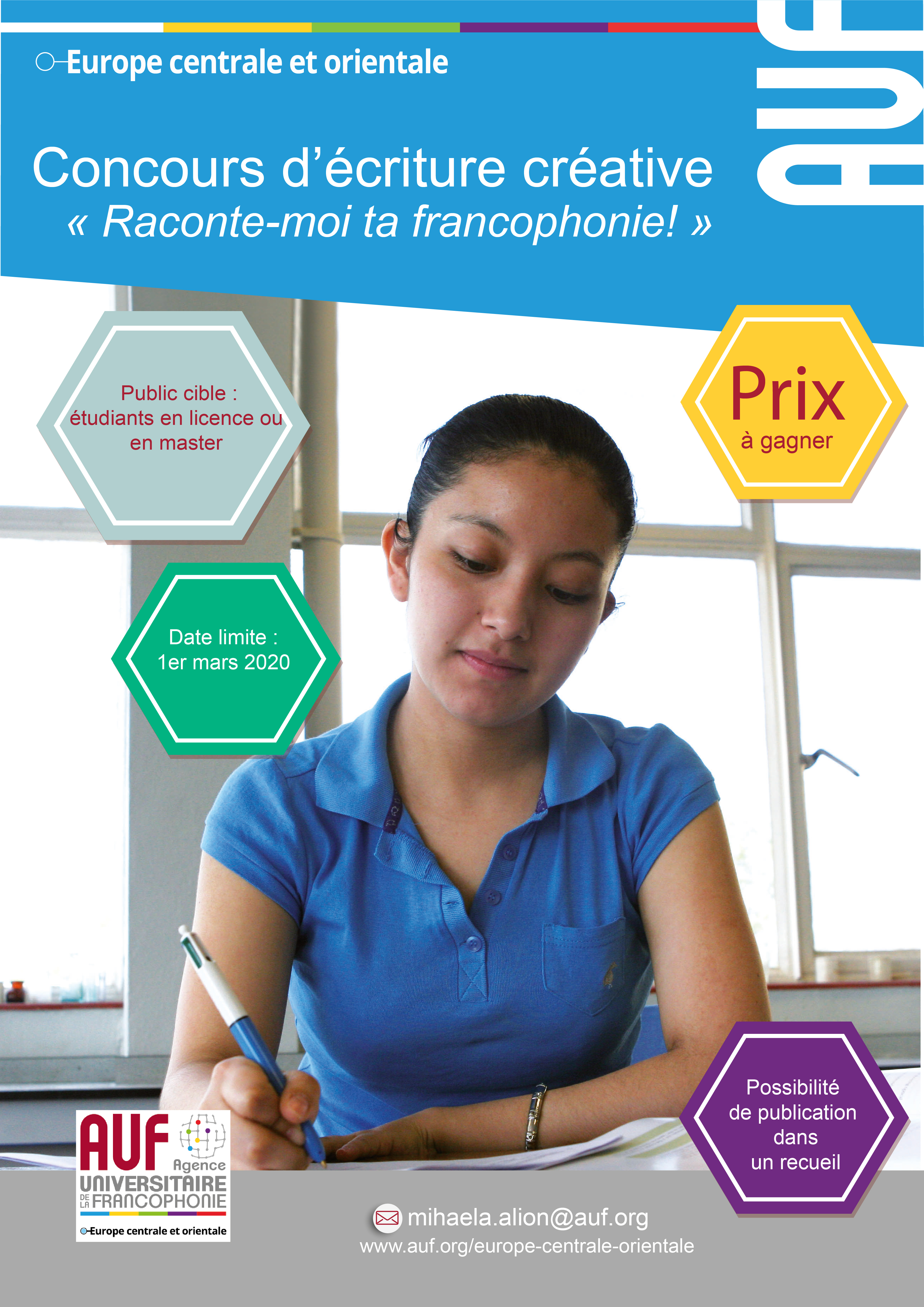 À l’occasion de la Journée Internationale de la Francophonie, l’Agence universitaire de la Francophonie en Europe centrale et orientale (AUF en ECO) lance le concours d’écriture créative intitulé « Raconte-moi ta francophonie ». Ce concours se déroule pendant la période allant du 28 janvier au 9 mars 2020.